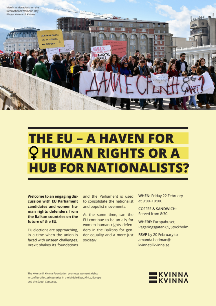 EU-valet närmar sig och unionen står den här gången inför utmaningar utan tidigare motstycke. Parlamentet har blivit ett forum för nationalister att stärka sitt inflytande över EU:s gemensamma politik. Kommer EU i framtiden att kunna fortsätta stötta arbetet för demokrati och jämställdhet i närområdet. Kan kvinnorättsförsvarare som jobbar i motvind på t ex Balkan räkna med EU i framtiden?