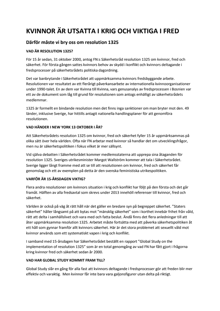 Vad är resolution 1325 och vad är den bra för? Vad har FN lyckats med under de 15 år resolutionen har funnits och varför behöver FN och medlemsländerna jobba vidare med de här frågorna? Sverige har lanserat en feministisk utrikespolitik men vad kan mer göras, och vad kan en organisation som Kvinna till Kvinna uträtta för att sätta ljuset på de problem som kvarstår med kvinnors säkerhet?
