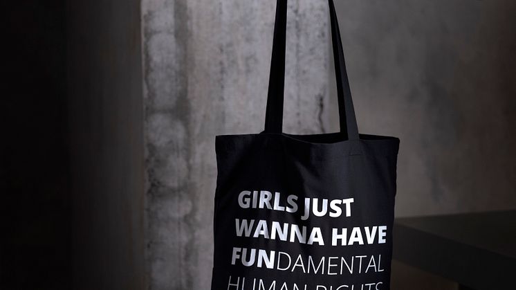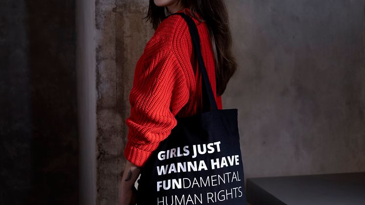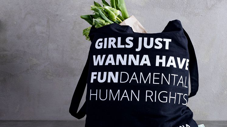 Köp en fairtrade-producerad tygväska i svart med ikoniska budskapet Girls just wanna have fundamental human rights, bidra till Kvinna till Kvinna med 195 kr.