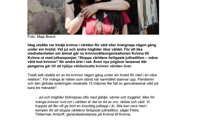 Idag utsätts var tredje kvinna i världen för våld eller övergrepp någon gång under sin livstid. Vid jul och andra högtider ökar våldet. För att öka medvetenheten om ämnet går nu kvinnorättsorganisationen Kvinna till Kvinna ut med julkampanjen “Stoppa världens farligaste jultradition – mäns våld mot kvinnor” för andra året i rad. Även nya julgåvor lanseras där pengarna går till att hjälpa våldsutsatta kvinnor världen över.