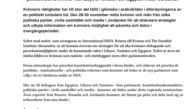 Kvinnors rättigheter har till stor del fallit i glömska i arabvärlden i efterdyningarna av en politiskt turbulent tid. Den 28-30 november möts kvinnor och män från olika politiska partier, civila samhället och media i Jordanien för att diskutera strategier och utbyta information om kvinnors möjlighet att påverka och bidra i övergångsperioder.