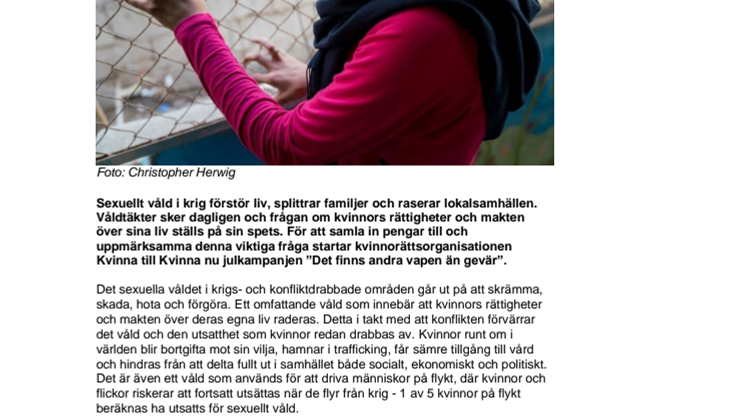 Sexuellt våld i krig förstör liv, splittrar familjer och raserar lokalsamhällen. Våldtäkter sker dagligen och frågan om kvinnors rättigheter och makten över sina liv ställs på sin spets. För att samla in pengar till och uppmärksamma denna viktiga fråga startar kvinnorättsorganisationen Kvinna till Kvinna nu julkampanjen ”Det finns andra vapen än gevär”.