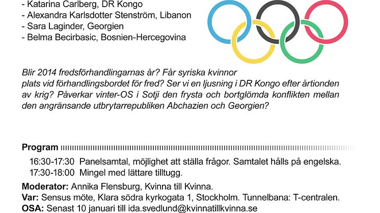 Kvinna till Kvinna bjuder den 13/1 in till det årliga utrikessamtalet om kvinnors situation i konfliktområden. I år riktar vi strålkastarljuset mot Syrien, Libanon, Demokratiska Republiken Kongo och mot Olympiska spelen i Sotji.